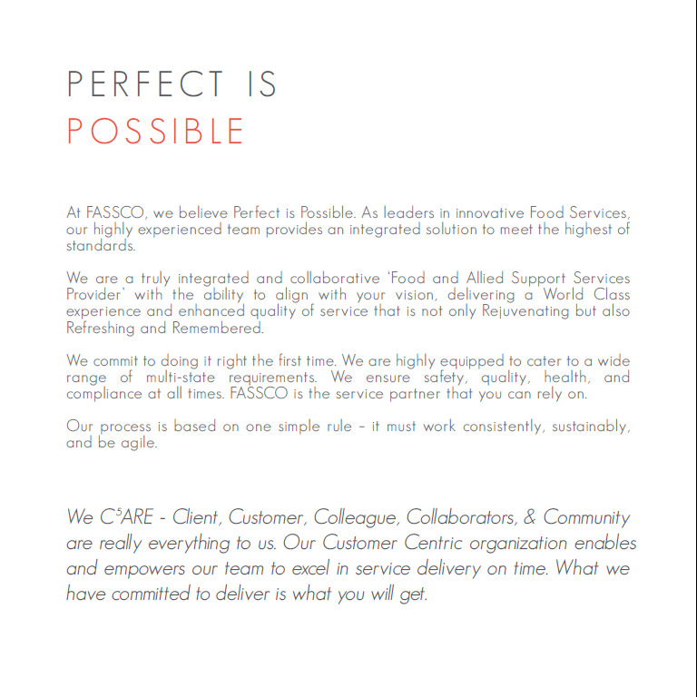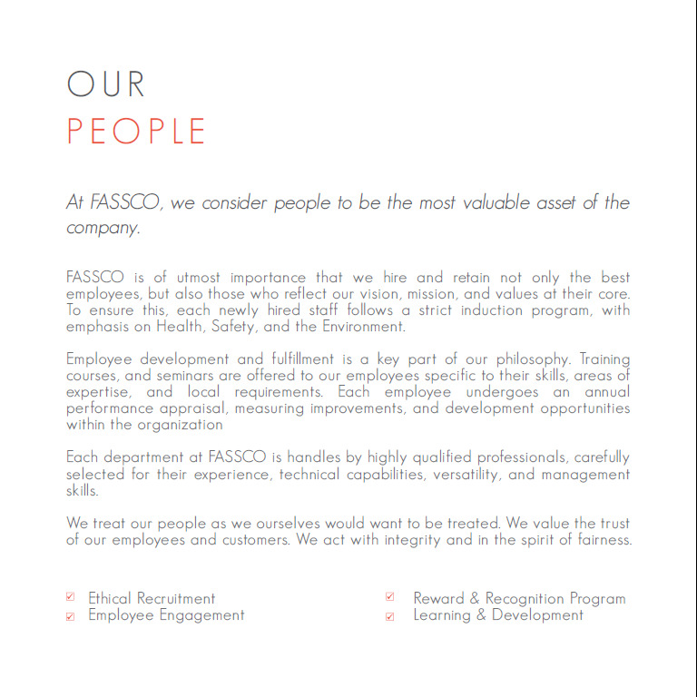 - Design and Layout: Design a clean, professional layout that enhances readability and visual appeal, ensuring the brochure effectively represents FASSCO’s brand identity.